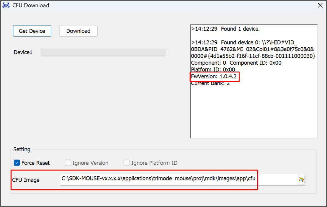 如果配置的 Vid 和 Pid 与 Mouse/Dongle 设置不一致,CFUDownloadTool 会识别不到设备。