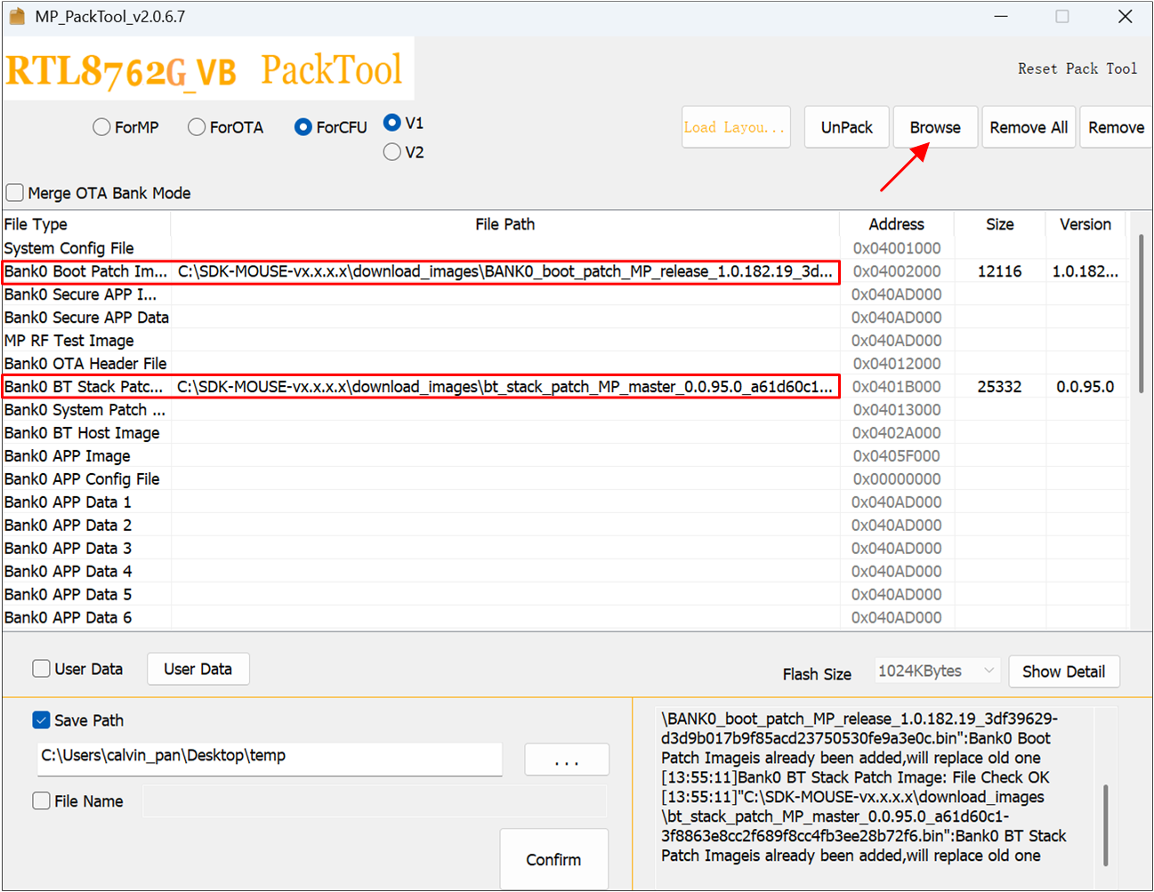 MPPackTool.exe, IC Type 选择 RTL87x2G_VB,选择 ForCFU,点击 Browse,选择需要升级的文件,以Bank0 Boot Patch Image和Bank0 BT Stack Patch Image为例,如下图所示。