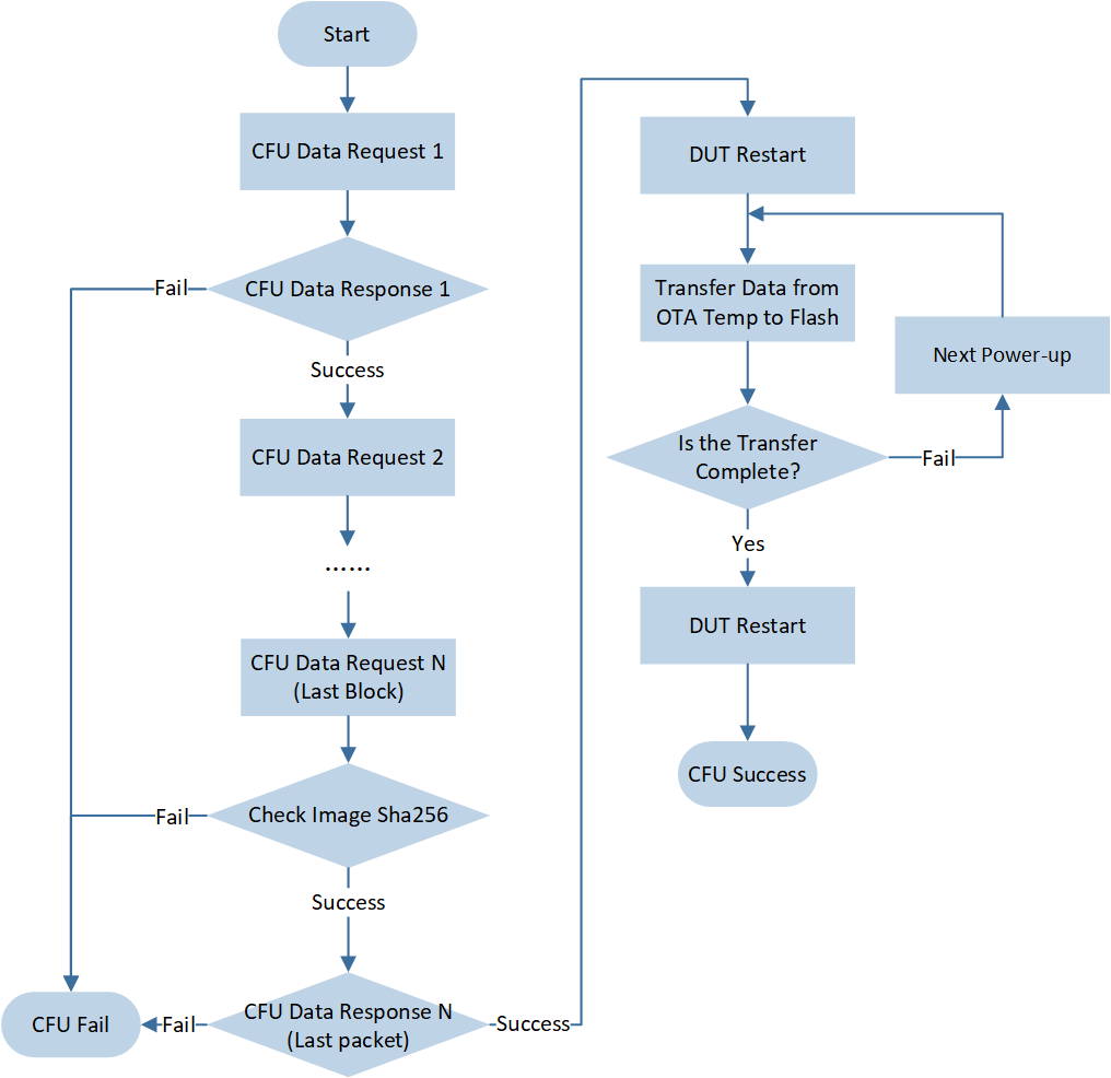 For handling error responses, the default behavior of the CFU tool in version V2.1.1.0 and earlier differs from the latest version. The upgrade process halts immediately only when receiving FIRMWARE_UPDATE_ERROR_WRITE. For other errors, the tool performs a retry. The upgrade is considered failed only if an error response is received again. If users need to modify this behavior of the tool, refer to CFU Tool demo code.