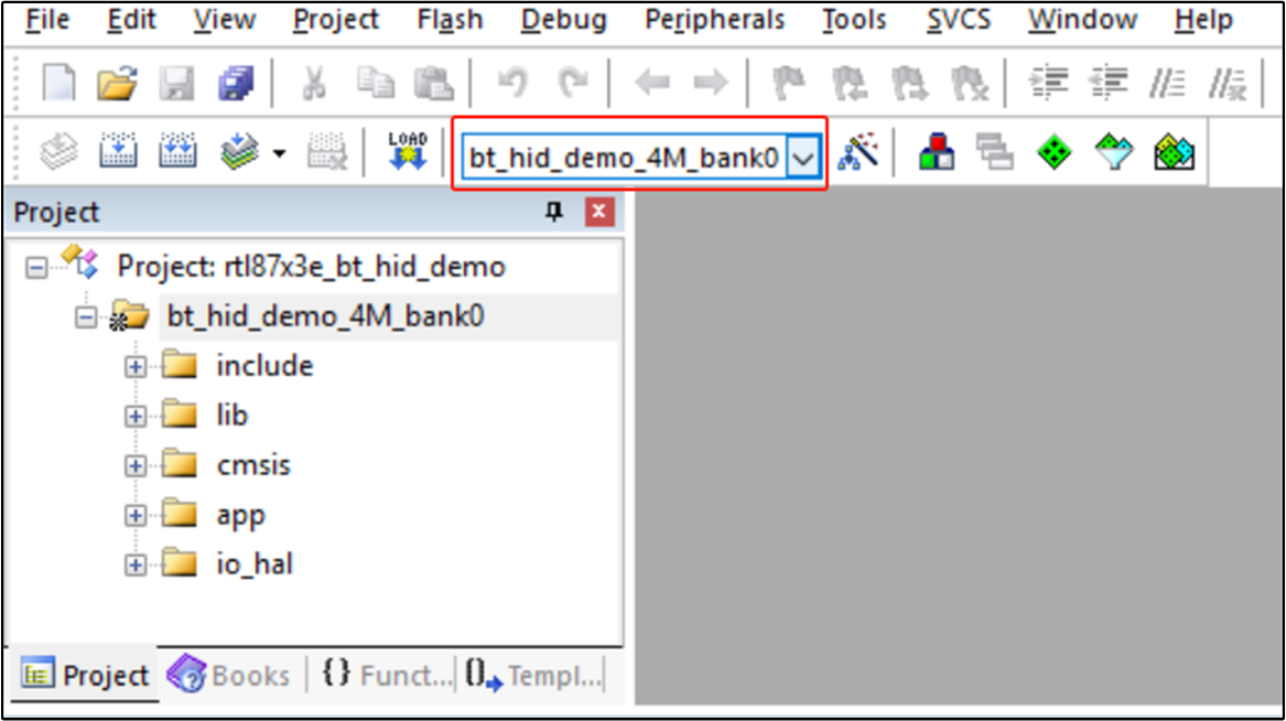 Take the project rtl87x3e_bt_hid_demo.uvprojx and target bt_hid_demo_4M_bank0 as an example, to build and run the sample with Keil development environment, follow the steps listed below: