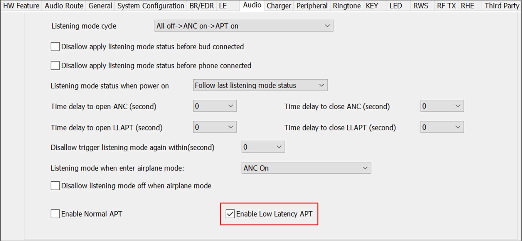 The audio route configuration for APT is demonstrated. You can implement the APT function by selecting the corresponding microphone. The specific meanings corresponding to different microphones can also be viewed in the MCUConfig Tool.