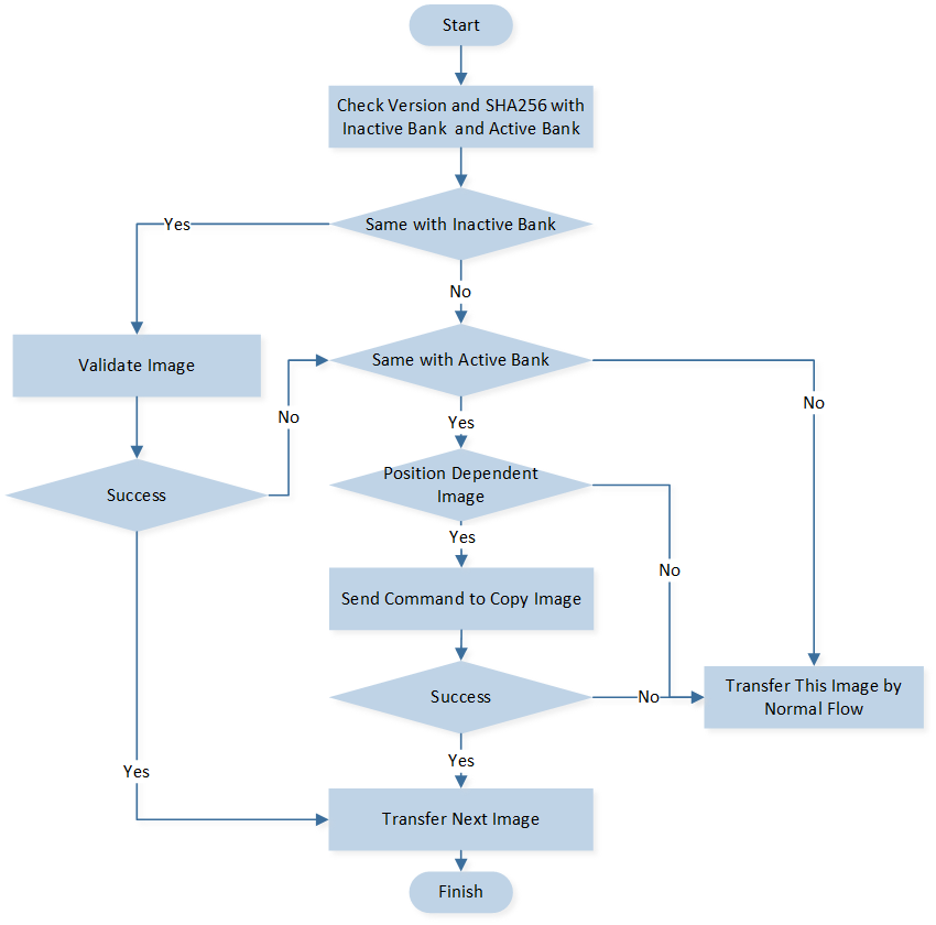 As mentioned above, to avoid image mismatches and omissions, packing whole images is mandatory. To improve upgrade efficiency, Image Skip and Image Copy mechanisms are designed to avoid unnecessary image transmission. At the beginning of the OTA process, the OTA tool will query the versions and checksums of all the images including both banks of the SoC. The flowchart for image skip and copy mechanisms is as follows.