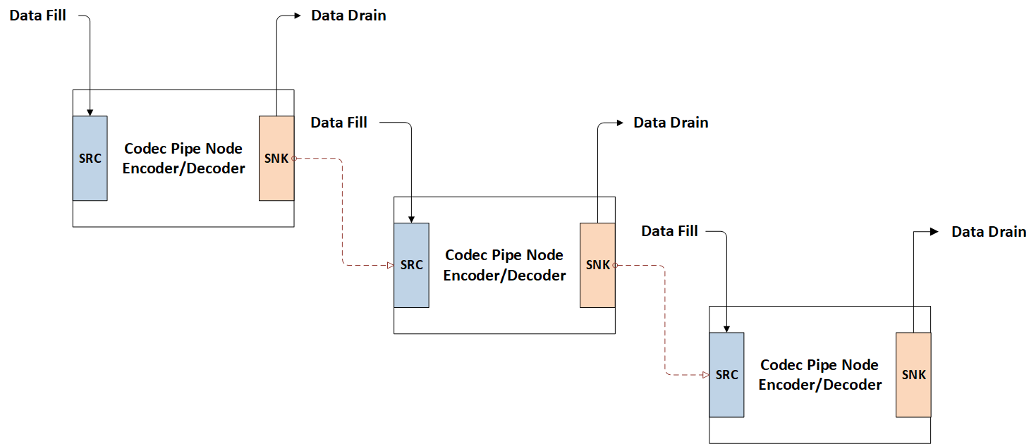 By establishing an abstract codec Audio Pipe model, the input data stream in one codec format will be processed and converted into an output data stream in another codec format. It is important to note that the Audio Pipe not only facilitates the conversion between different codec types but also enables the conversion of specific codec attributes within the same codec type, allowing the Application to configure it according to specific requirements. Additionally, this transformation method can also be cascaded, meaning the data stream output from the sink endpoint of one Pipe can serve as the input data stream for the source endpoint of the next Pipe.