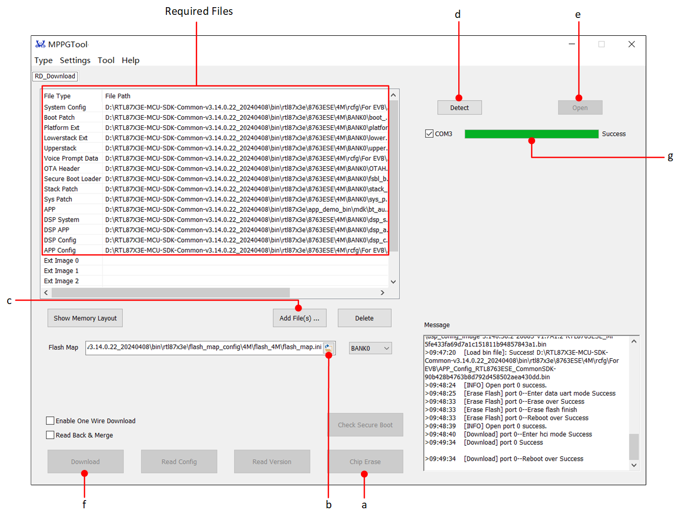 Taking RTL8763ESE as an example, the MCU configuration file is located at: \bin\rtl87x3e\8763ESE\4M\rcfg\For EVB.
