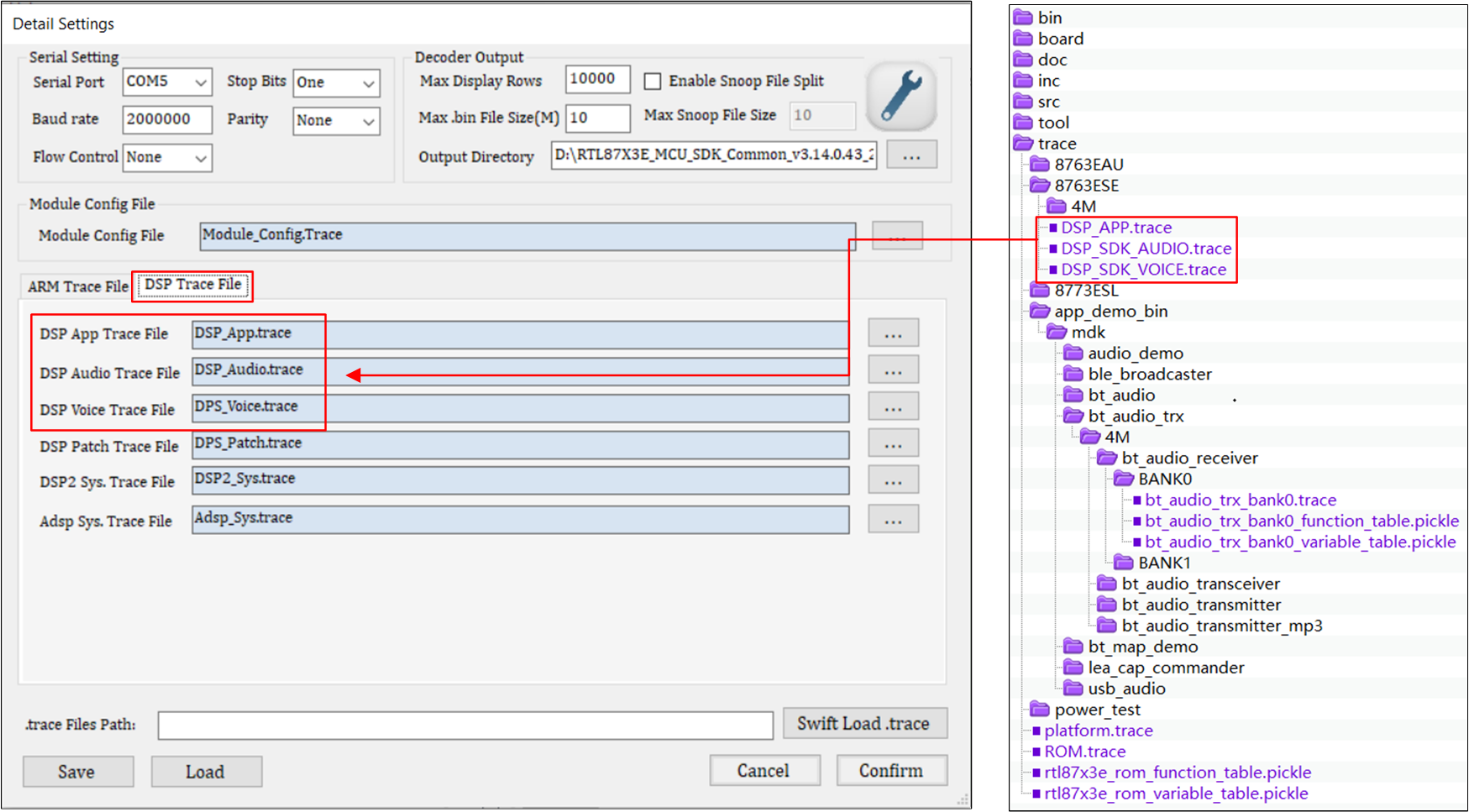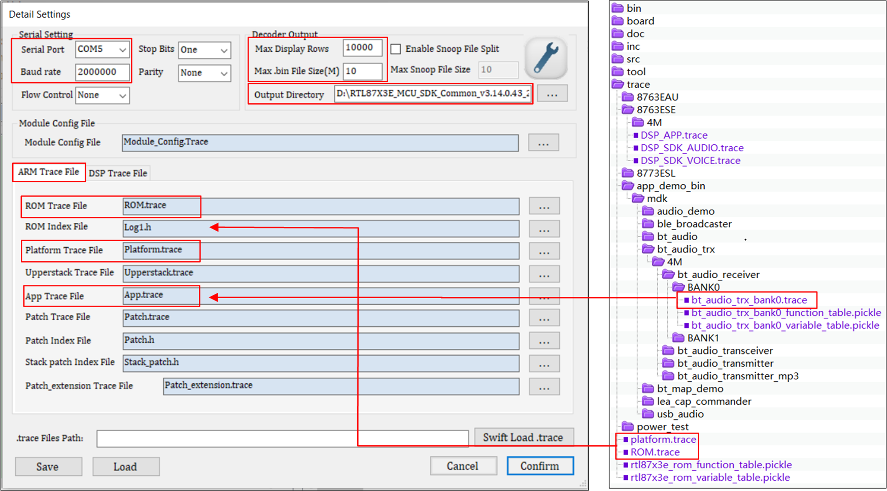 Set parameters in the following UI according to requirements and click Confirm. Taking bt_audio_receiver demo bin as an example, the trace path is shown as follows.