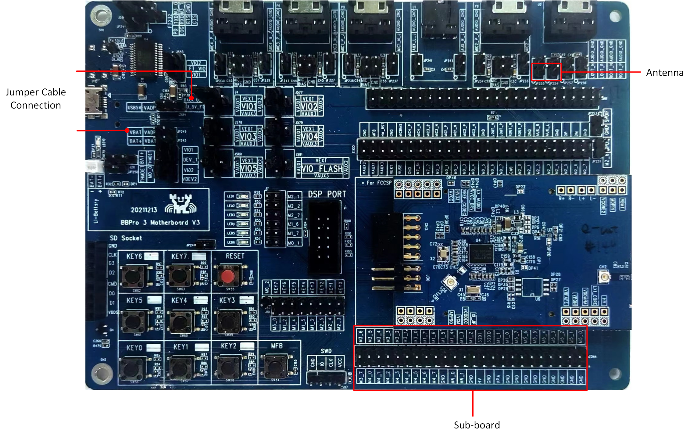 For the Antenna marking, users need to connect an antenna to the designated port. As for the Subboard, it should be inserted into the corresponding socket on the main board. Additionally, the Jumper Cable Connection is required to provide USB power. Users need to connect jumper cables accordingly to establish the connection and support the USB power supply: