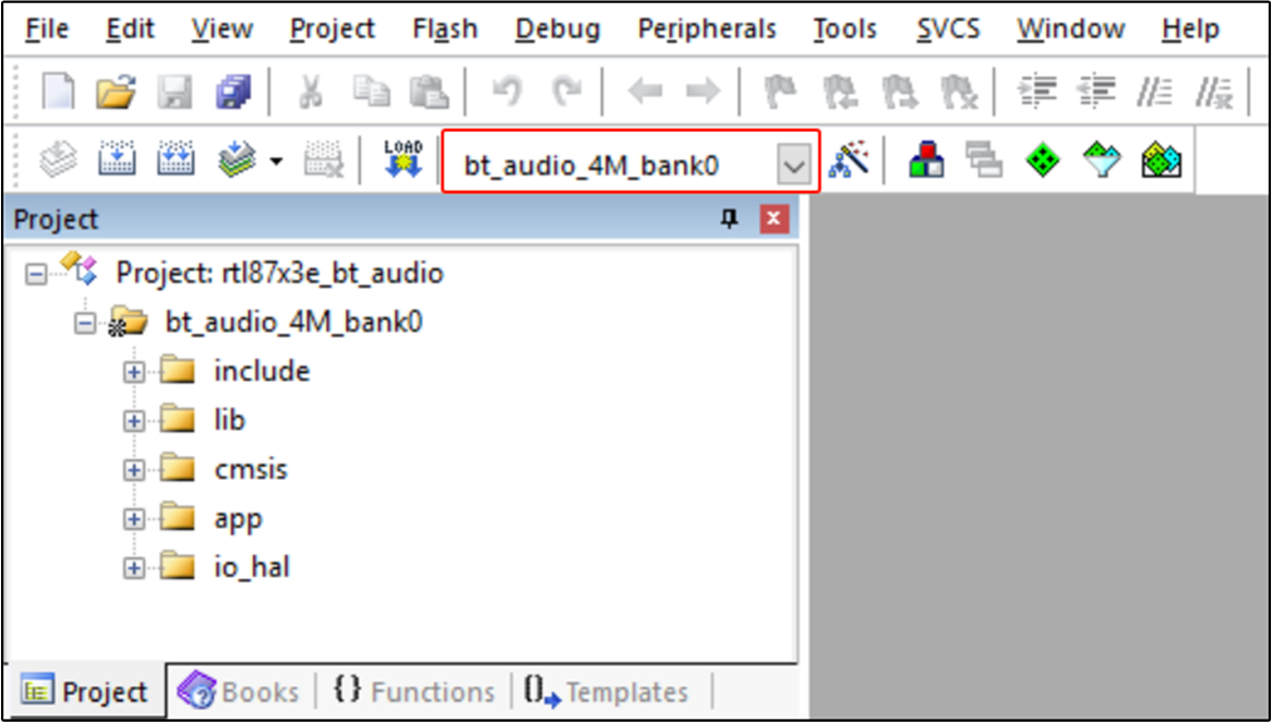 Take the project rtl87x3e_bt_audio_demo.uvprojx and target bt_audio_demo_4M_bank0 as an example, to build and run the sample with Keil development environment, follow the steps listed below: