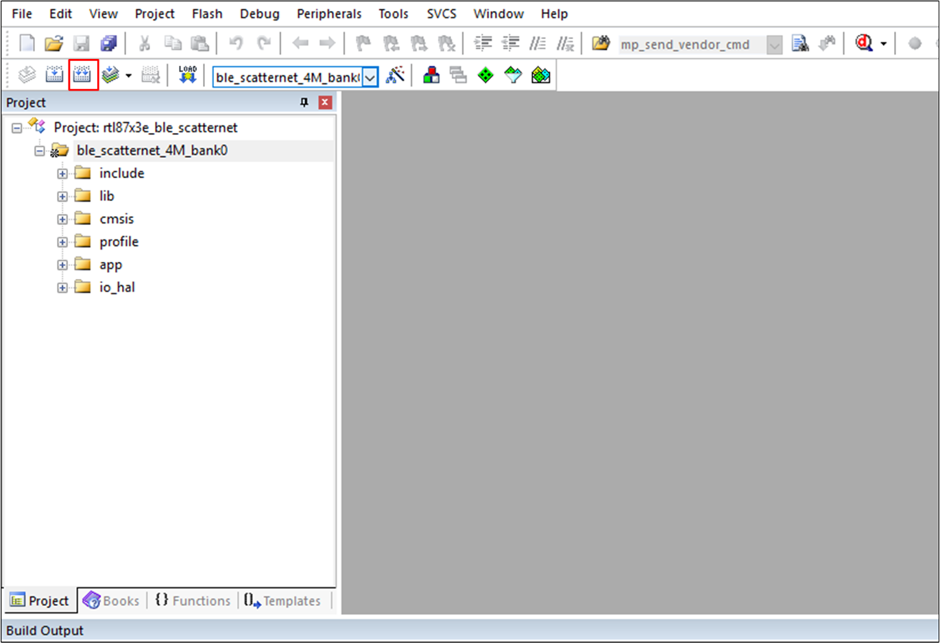 and target ble_scatternet_4M_bank0 as an example. To build and run the sample with Keil development environment, follow the steps listed below: