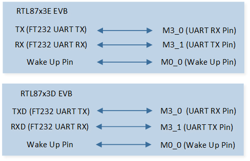 As shown in GDMA Demo Code 4/5 Hardware Connection Diagram. RTL87x3E: On EVB, TX is connected to M3_0, RX is connected to M3_1, FT_VIO is connected to VIO1, and CON3 is connected to PC. RTL87x3D: On EVB, TXD is connected to M3_0, RXD is connected to M3_1, FT_VIO is connected to VIO1, and P2 is connected to PC. |