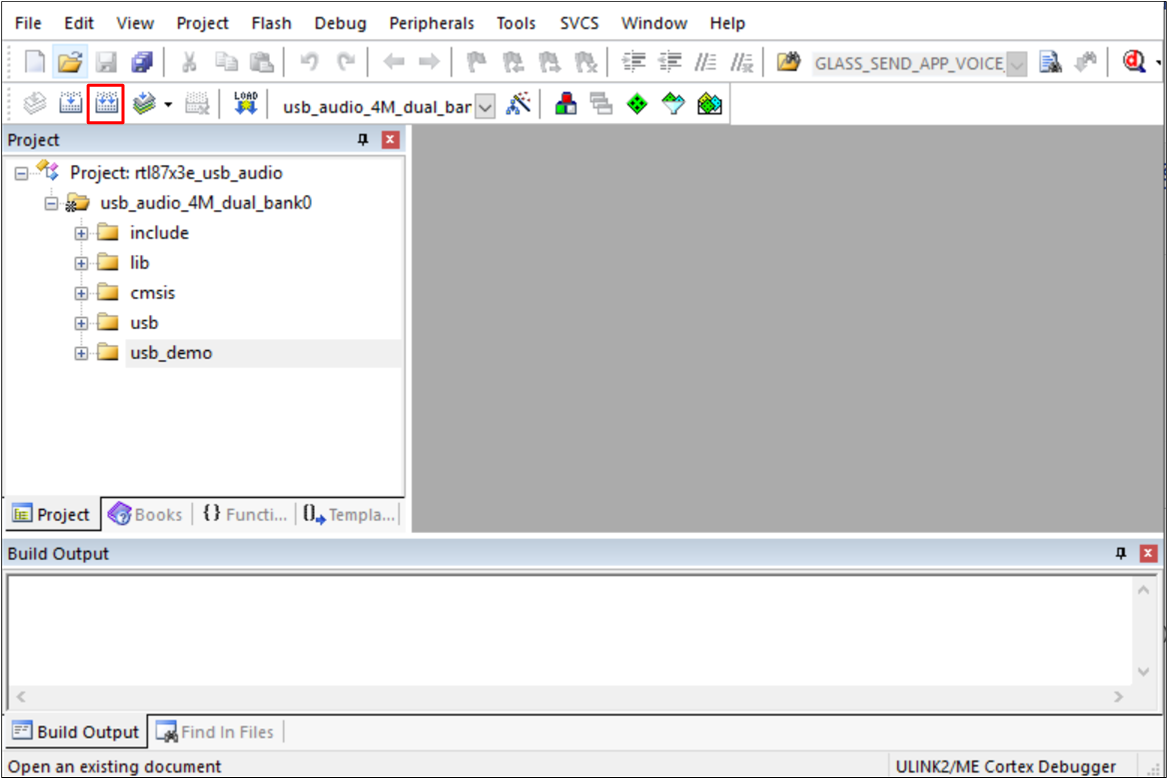Take the project rtl87x3e_usb_audio.uvprojx and target usb_audio_4M_dual_bank0 as an example, to build and run the sample with the Keil development environment, follow the steps listed below: