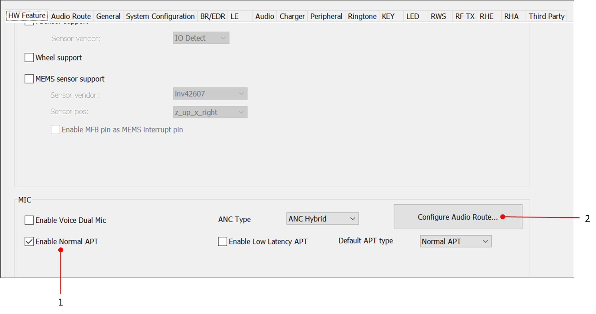 The audio route configuration for APT is demonstrated. You can implement the APT function by selecting the corresponding microphone. The specific meanings corresponding to different microphones can also be viewed in the MCUConfig Tool.