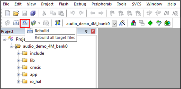 Take the project rtl87x3e_audio_demo.uvprojx and target audio_demo_4M_bank0 as an example,