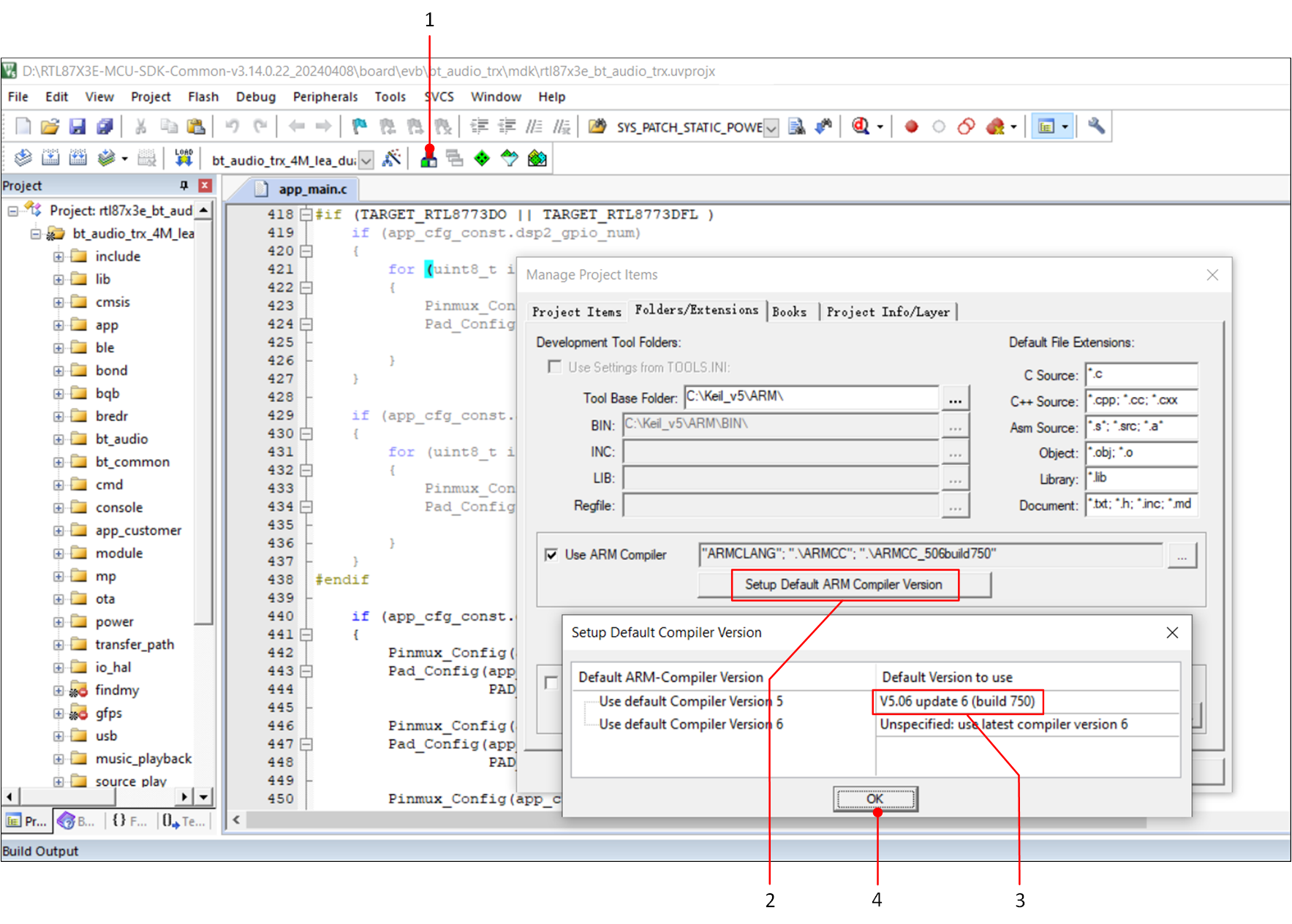 Configure the default compiler to ARMCC_506build750, as shown below.