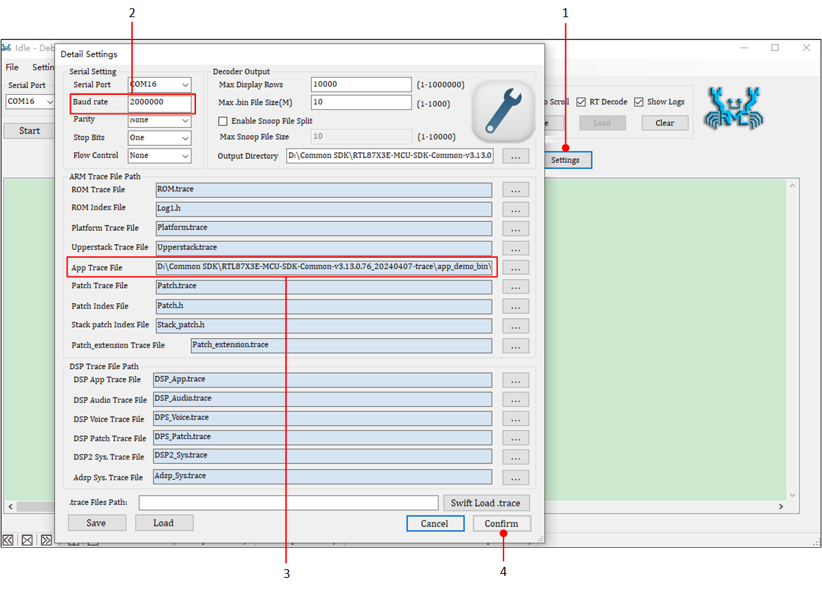 Double-click to run DebugAnalyzer.exe, click Setting, Baud rate is set to 2M by default, and load the corresponding .trace file in the App Trace File.