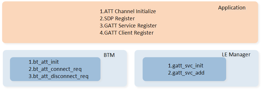 The table below shows a simple description of GATT over BR/EDR API. Related APIs are provided in the sdk\inc\framework\bt\bt_att.h, sdk\inc\ble_mgr\bt_gatt_client.h, and sdk\inc\ble_mgr\bt_gatt_svc.h.