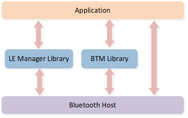 The application uses BR/EDR and LE manager module. The above figure shows the relationships between several modules in the application. More information about these modules can be found in the BR/EDR Host and LE Manager documentation.