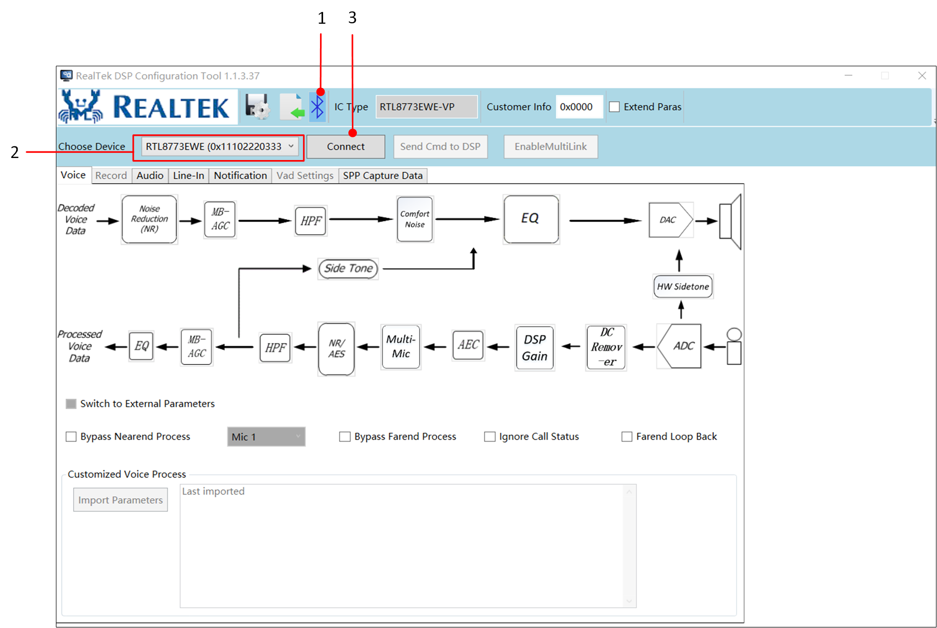 在 PC 上打开 DSPConfigTool.exe,在 Windows 设置中搜索 EVB 的蓝牙并连接。PC 连接成功后,按下图步骤操作 tool,随后 tool 会提示是否成功连接上 EVB。