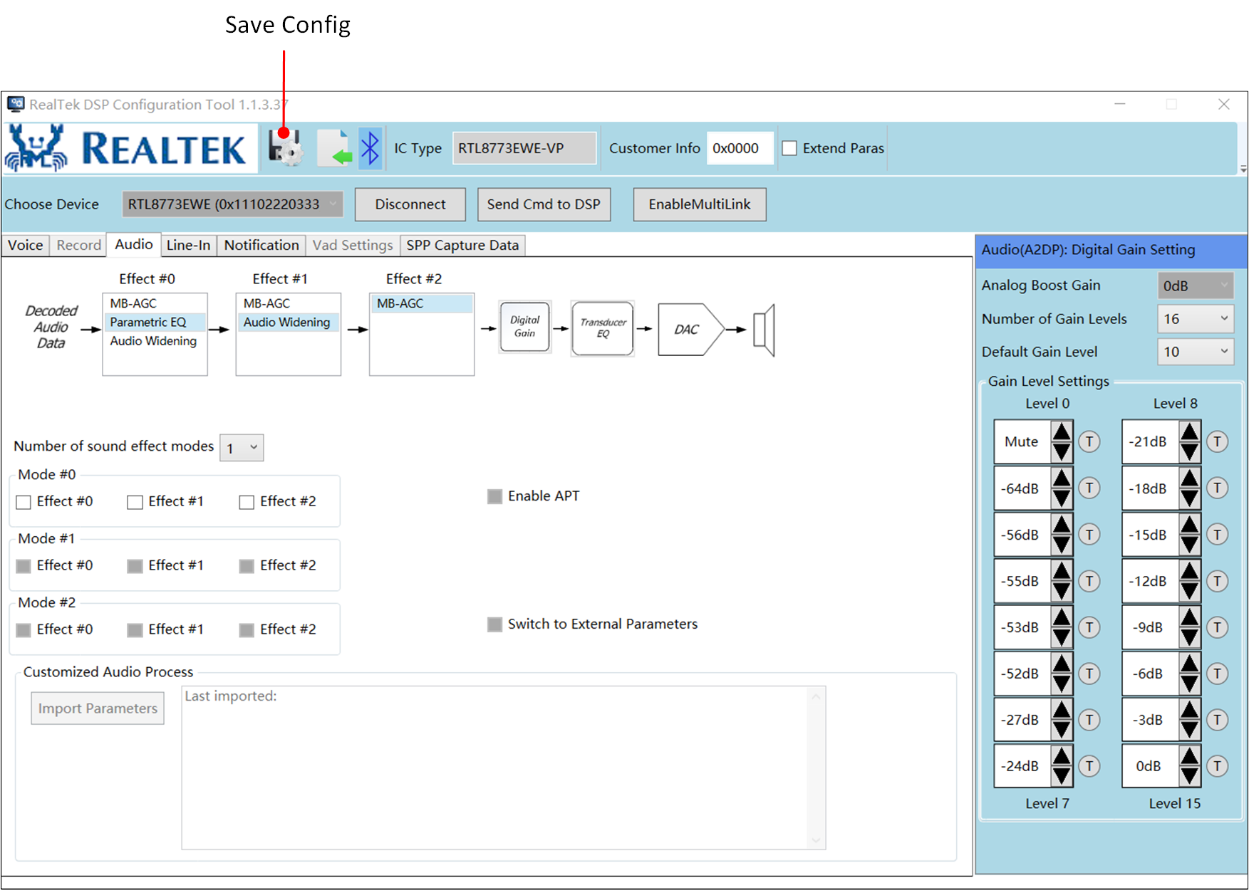 反复调节音频参数,直到达到满意的效果。点击 tool 的 Save Config,即可将参数保存到