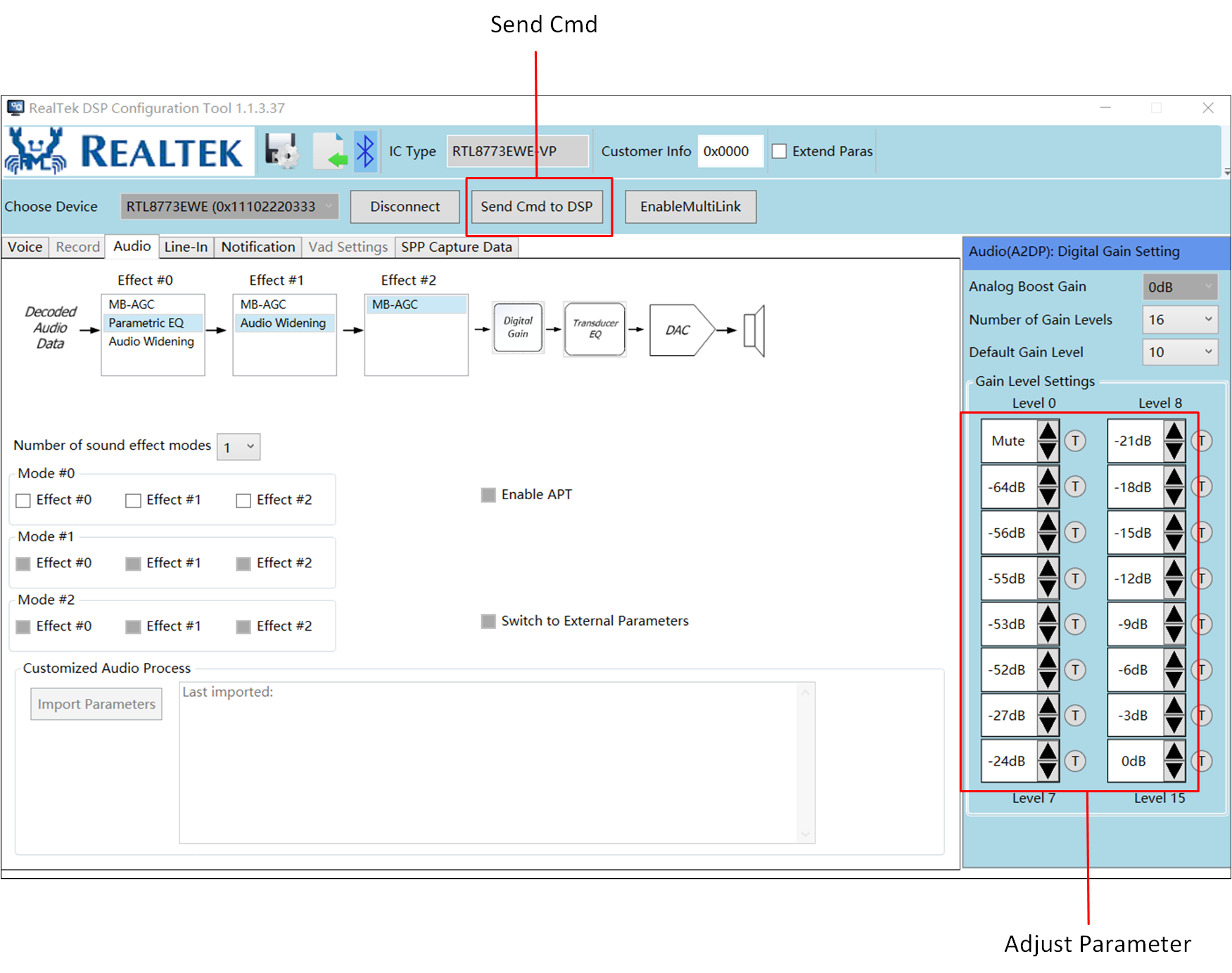 通话的效果在 tool 的 Voice 选项卡下调节,本地播放和 A2DP Sink 播放的效果在 tool 的 Audio 选项卡下调节。调节时需确保 DSP 正在运行(通话或播放),否则发送指令会报错。 调节完参数后,点击 Send Cmd to DSP 将参数发送到 EVB,EVB 随即启用新的音频参数。