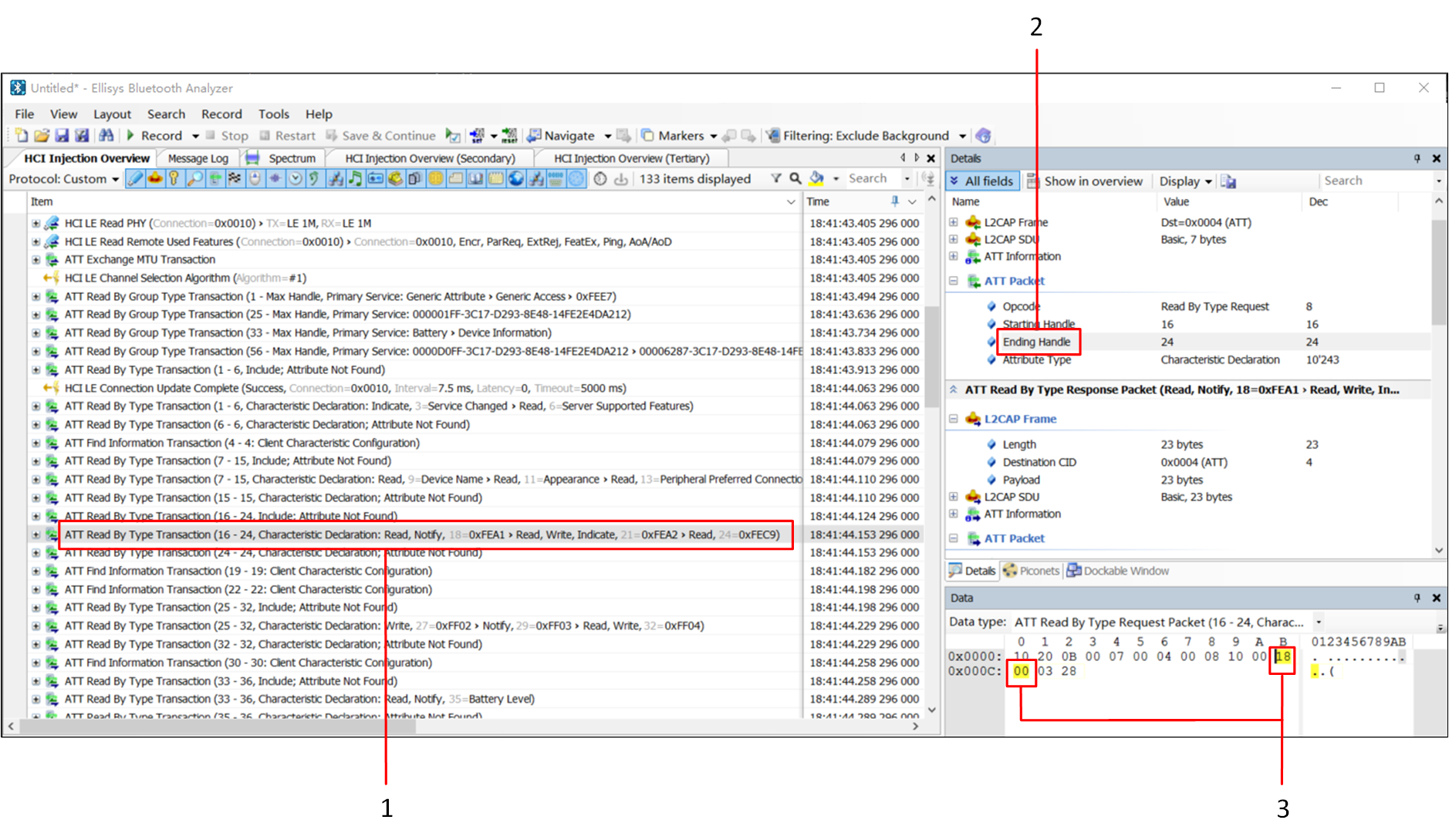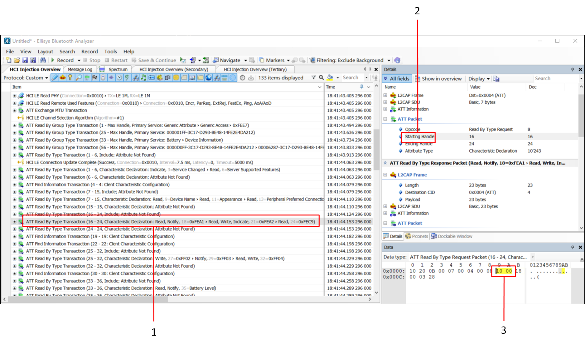 .cfafile in Ellisys Bluetooth Analyzer.exe, select ATT Read Type Transaction, and read the values in sequence 3 in the figure to fill in the initial handle position of the SDP table. If the registered service changes, it needs to be refilled.