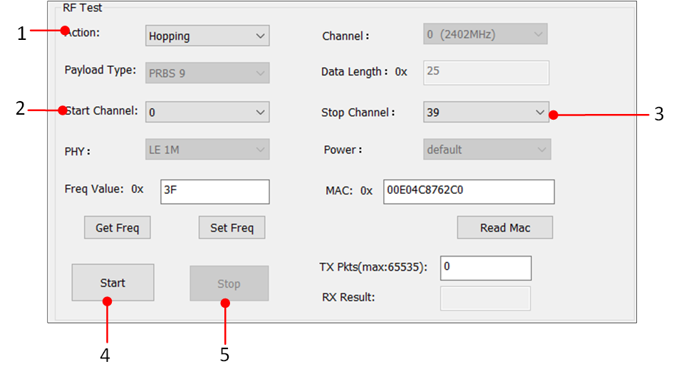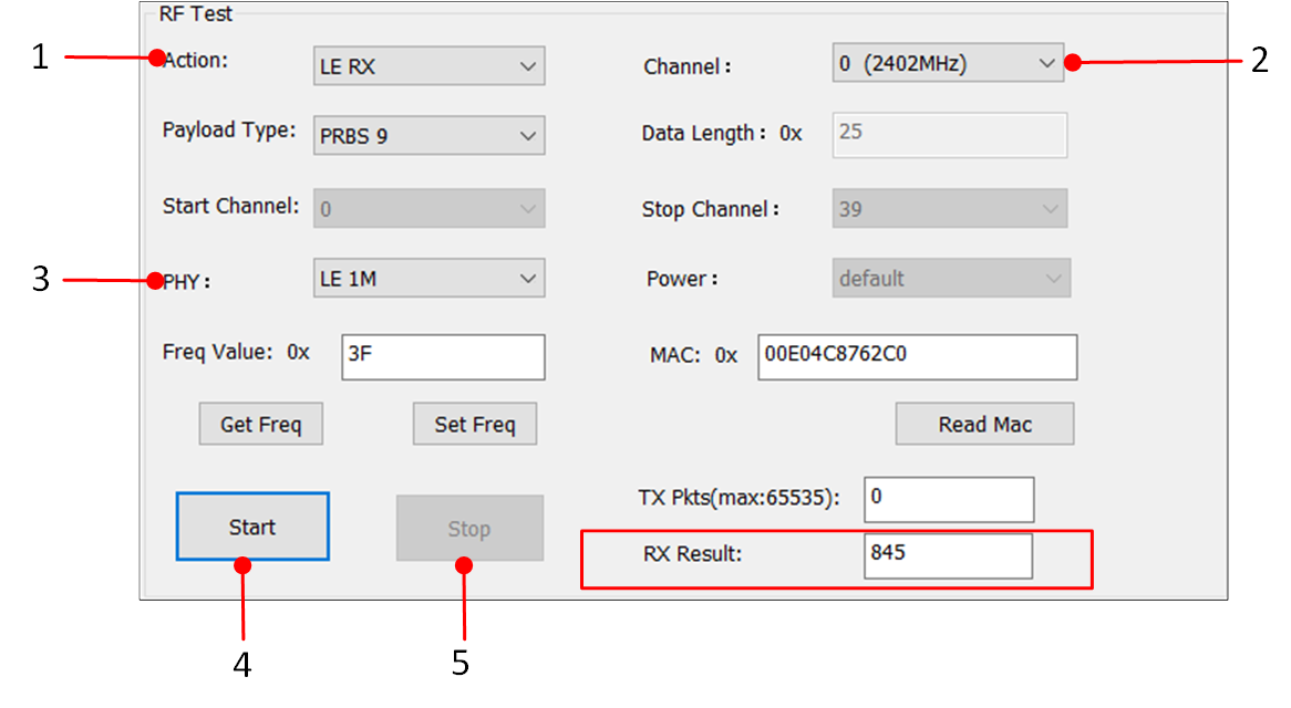 点击 Stop 后接收结果会显示在 BLE RX 测试 的红色框内,RX Result 即 RX Received Packets,用户可以根据接收到的包的个数计算 PER 。