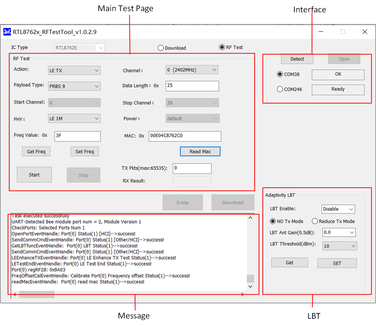 BLE 的 RF 性能测试包含信令和非信令两种测试模式,其中 RTL8762x_RFTestTool 用于非信令测试,主页面功能区块如下图: